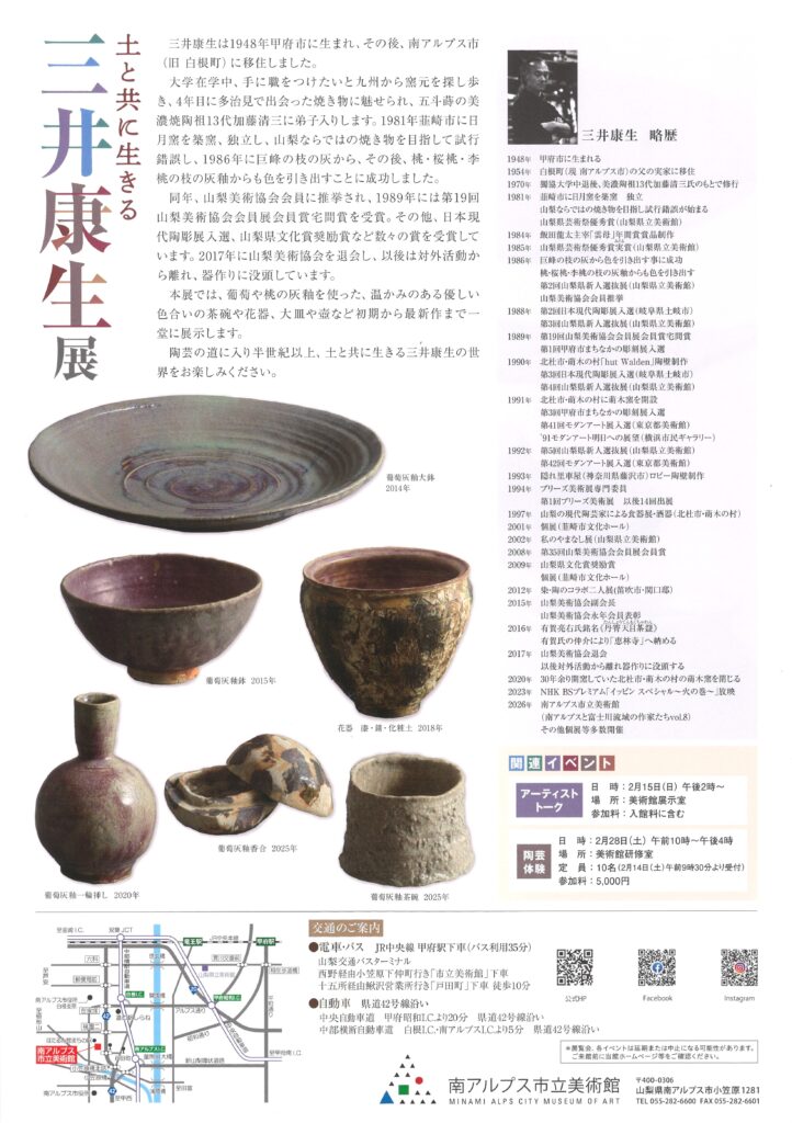 展覧会 2025.12.24 令和8年2月14日(土)~3月22日(日) 「土と共に生きる 三井康生展」 会期:令和8年2月14日(土)~3月22日(日) 開館時間:午前9時30分~午後5時(入館は午後4時30分まで) 入館料:一般320円・大学生260円(20名以上の団体は2割引き) *高校生以下・市内在住の65歳以上・障害者手帳をお持ちの方と付き添いは無料です。