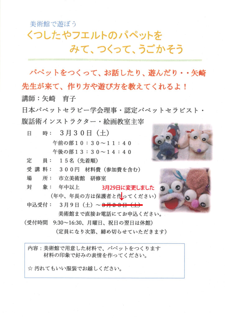 3月30日(土) 美術館で遊ぼう!くつしたやフエルトのパペットをみて、つくって、うごかそう!